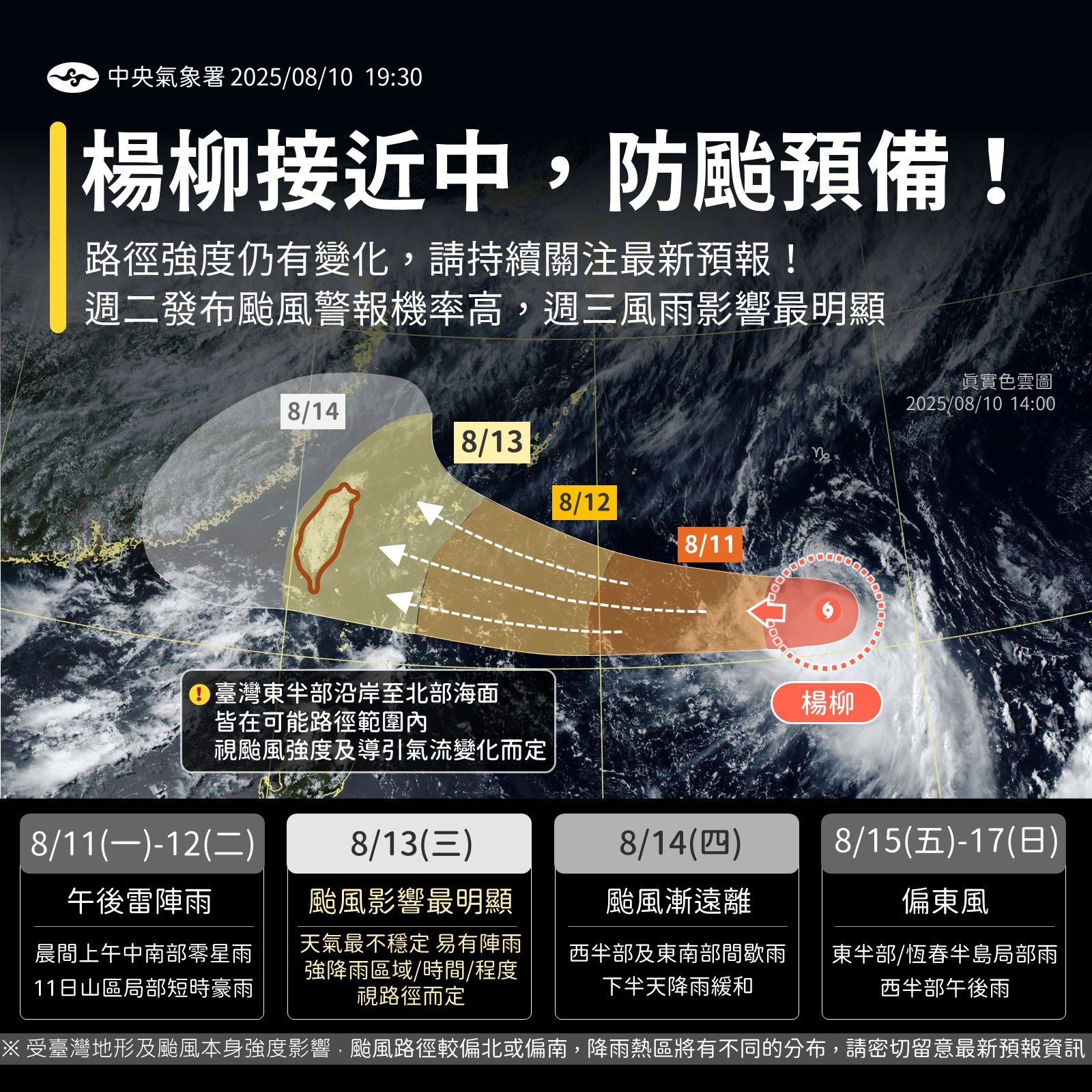 楊柳颱風的移動速度較快,且路徑帶有變數,民眾應持續關注氣象動態,切勿掉以輕心。